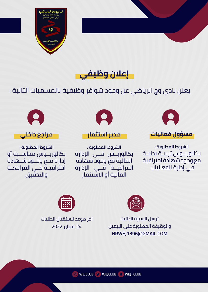 أعلن نادي وج الرياضي بالطائف عن وظائف إدارية للجنسين لحملة شهادة البكالوريوس .