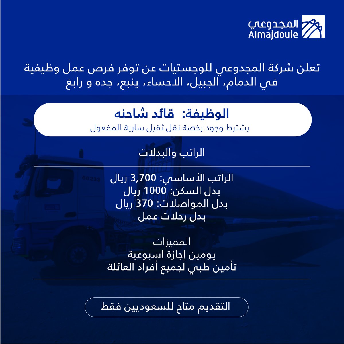 أعلنت شركة المجدوعي للوجستيات عن وظائف سائقين بعدة مدن بالدمام، الجبيل، الاحساء، ينبع، جدة، رابغ .